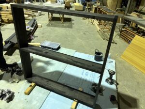写真は、組み上がったフレームに着色を施している作業の様子です。
